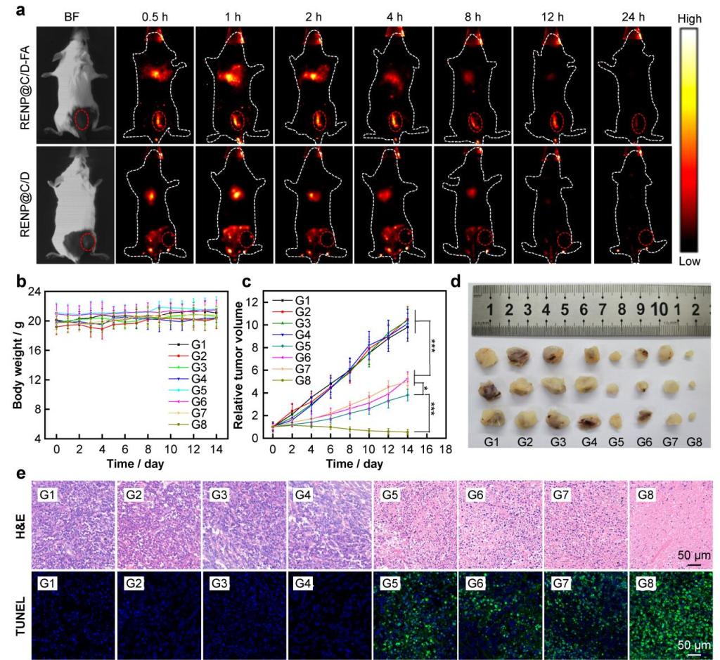 这些研究结果表明,RENP@C/D-FA在FA的辅助下能有效地在肿瘤中积累,在肿瘤治疗中具有巨大的潜力。所有八组小鼠的体重在治疗后变化很小,表明纳米复合材料具有良好的生物相容性。其中RENP@C/D-FA+NIR-IIb(G8)组在体内显示出最佳的肿瘤治疗效果,表面联合治疗平台具有显著优势。